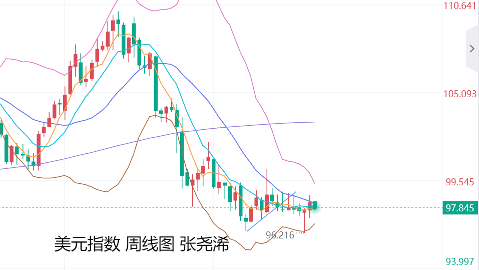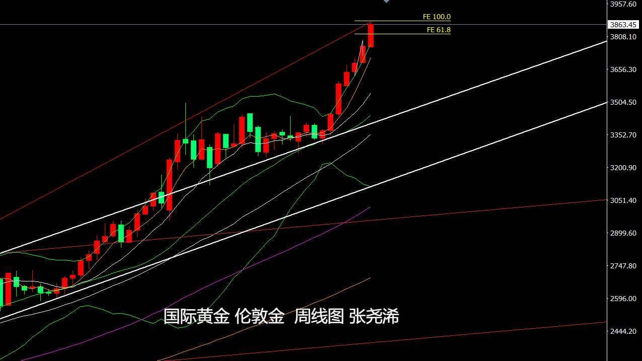 周图,金价自去年开涨攀升以来,如期第4次回踩中轨线支撑,并再度向上攀升,且不断触及给出的看涨目标位,目前依托布林带上轨支撑连续走强,当下虽冲出布林带之外,并也如期触及给出的看涨目标位附近,有阻力回撤风险,但根据前几周表现和指标信号来看,回撤力度也有限,整体走强趋势未有减弱迹象,操作将继续保持看涨上行不变。