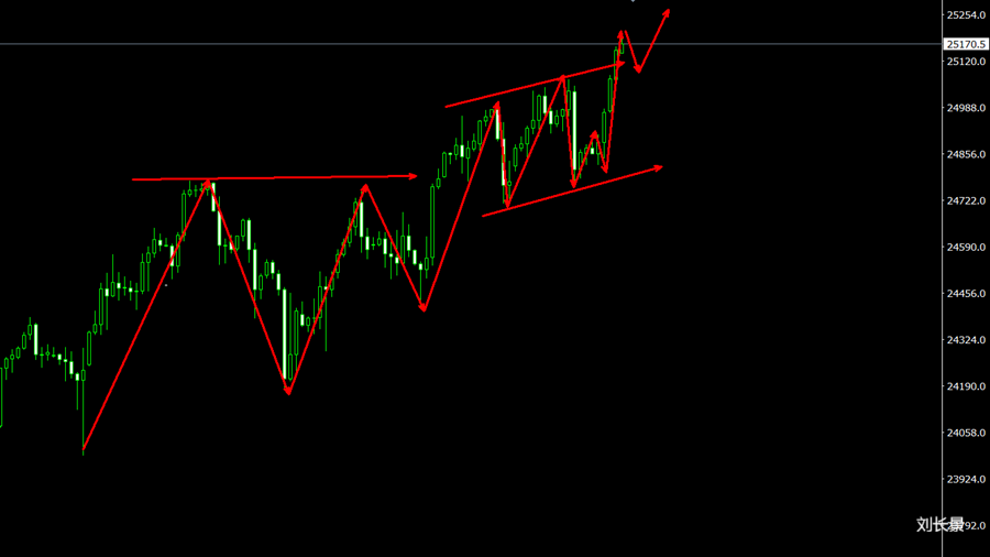 纳指市场昨日开盘在25143.13美元,后行情先拉升给出25193.71的新高后行情震荡回落,日线最低给到了24962.61美元,后整理,日线最终收线在了25085.6美元,后日线以一根下影线很长的锤头形态收线,而这样的形态收尾后,纳指调整已经结束,有进一步上涨的概率。综合来看,刘长景总结:纳指区间震荡之后,多头再次企稳反弹,今日操作上考虑回撤布局多单为先,高空为辅,上方关注25200-25300美元阻力,下方关注25090-25000美元支撑。
