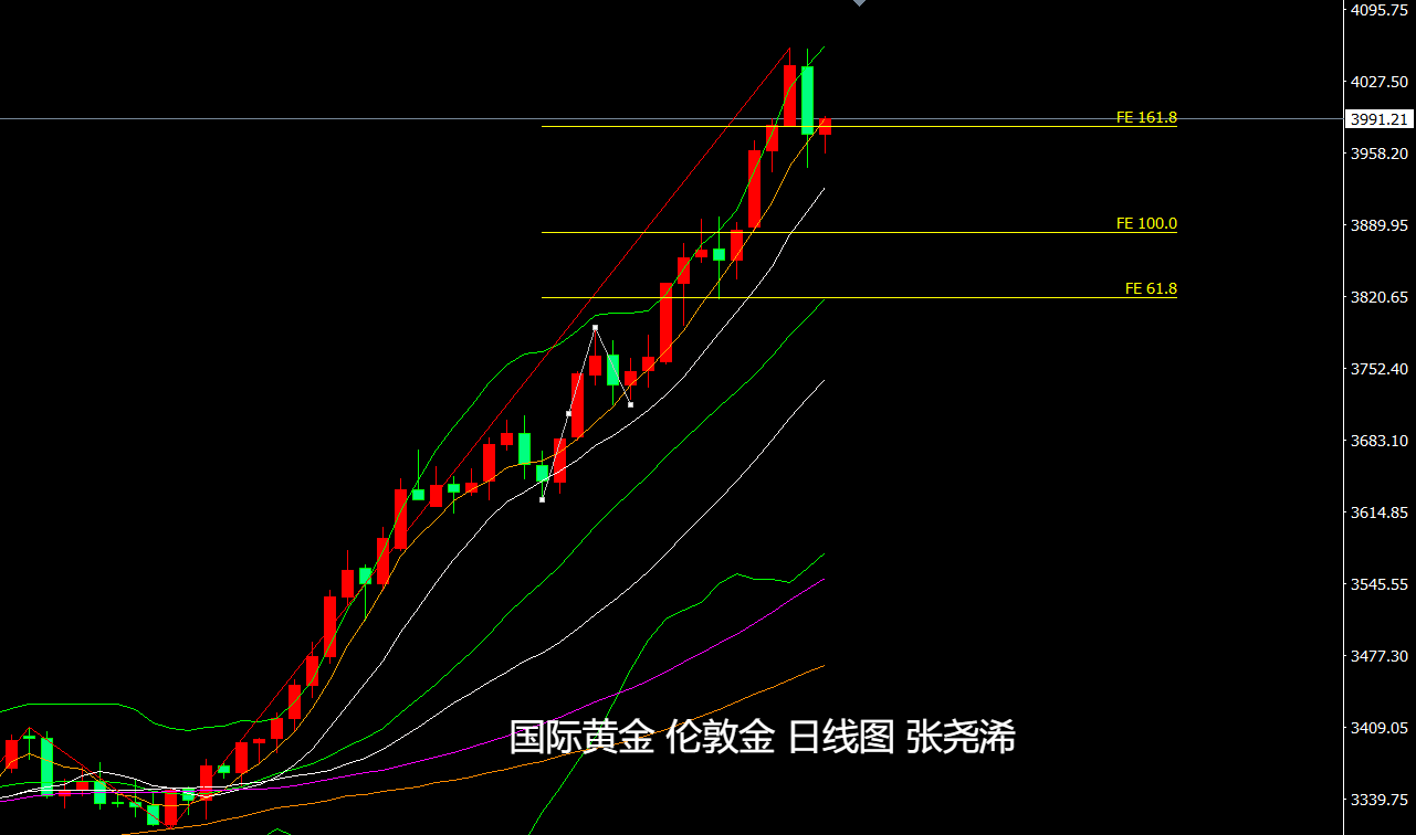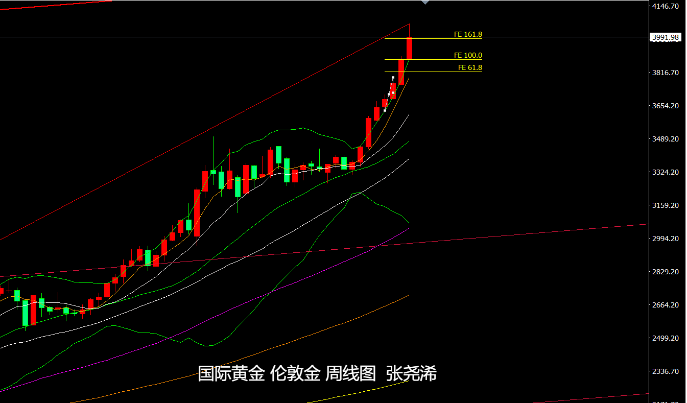 周图,金价自去年开涨攀升以来,如期第4次回踩中轨线支撑,并再度展开持续向上攀升的多头行情,不断到达给出的看涨目标位,本周强势运行在布林带上轨之外,昨日也如期走出了回调行情,本周重点留意是否能收取倒垂见顶形态,来判断下周将在何处支撑再度看涨,如持稳收在3980美元上方,则下周可继续看涨,反之下周将面临回落触及3882或3820美元附近支撑后再度看涨攀升。