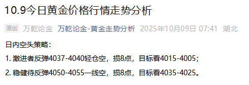- 综合来看:黄金长期上升通道保持完好,但短期回调风险增强;上方短期关注4015-4020一线阻力,下方短期关注3940-3945一线支撑,若破位,将测试3900一线重要支撑位。【文末+本人,关注“ 万乾论金-黄金走势分析 ”每日实时分享现价单及操作解套策略】国际黄金、白银、原油,期货沪金、沪银、融通金/积存金等在线现价单,每日免费分享!