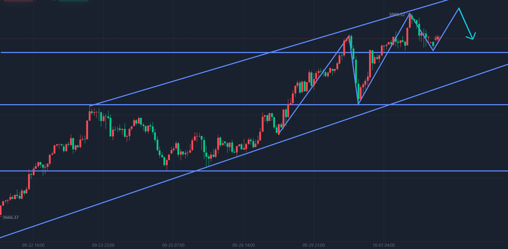 黄金继续保持多头趋势看涨,交易依旧是回落做多。本周行情目前,周一,周二,周三都是阶段性上涨,并且在亚欧盘有新高,但美盘每次都给出了回落空间,周三在刷新高点至3895后,回落至3855附近,也算是给顺势做多的机会,所以,连续前三天的行情看,今天关注亚欧盘是否有新高的可能,如果按照前面的力度,每天都有接近80/100个点的空间,那么,在绝对的强势下,今天关注3935附近,当然,这种看法是没有太多的理由,全凭市场情绪。