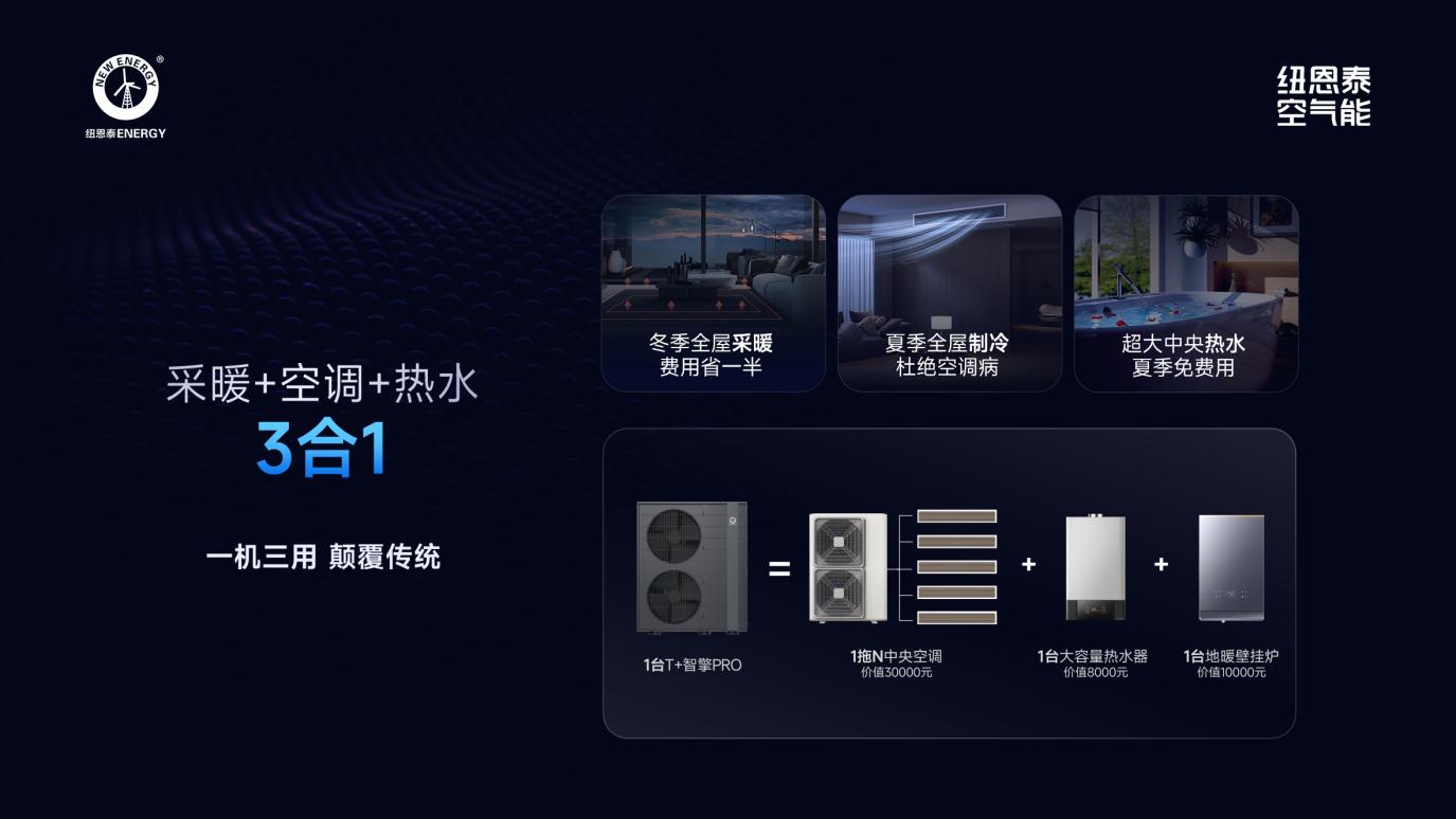 要是你正在给别墅选空气能,那一定要看看纽恩泰这款T+智擎Pro·变频三联供,它就是为别墅量身打造的。