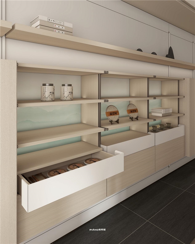 茶室作为宋式生活的核心场景,是品茗、插花、冥想的静谧天地。皮阿诺协奏・梦华系列茶室柜体以榫卯结构为骨架,岩佩钛狼灰铝合金与圆弧层板装饰条、装饰堵头的组合,既延续了榫卯 “刚柔相济” 的特质,又赋予空间现代质感。柜体搭配 “雨过天青云破处” 的天青色渐变背板,3D 数码打印的山水纹路在超导背板灯的映衬下,与风雅浅榆木纹的温润肌理相得益彰,营造出 “沉稳中见灵动” 的诗意氛围。
