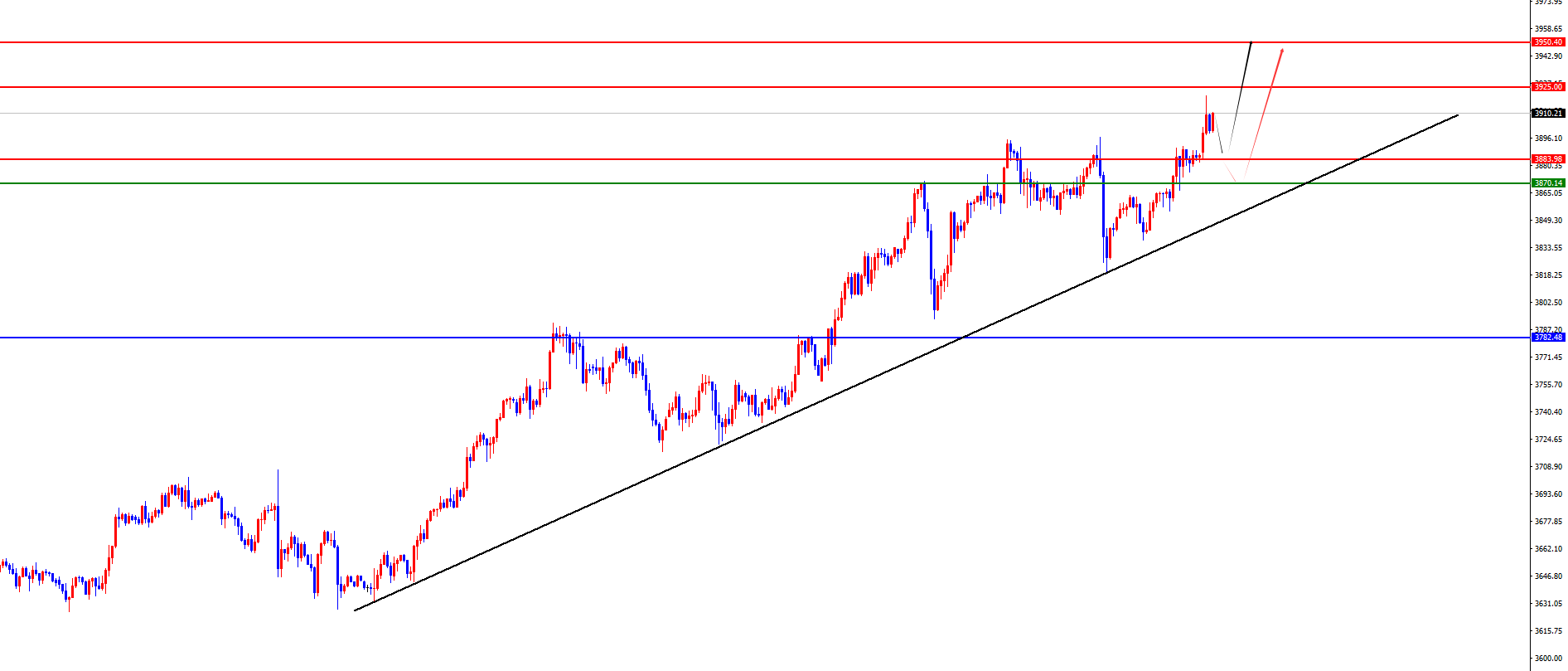从多周期分析,首先观察月线节奏,从长线上看3130位置是长线走势的分水岭,价格在此位置之上长线多对待即可。从周线级别看,目前周线多空分水岭于3531位置,价格在此位置之上中线多对待即可。从日线级别看,暂时需要关注3782区域支撑,此位置之上波段多对待,目前继续右侧交易方式对待。从四小时上看,近期四小时上价格有两种方式,第一中是价格距离日线支撑较远时,价格依托四小时支撑上涨,价格进行下破四小时支撑后没有延续,而是依托下破四小时支撑后低点位置继续上涨。第二中距离日线较近时,价格测试到日线支撑后上涨。上周五价格明显属于第一种情况。目前四小时上暂时关注3870及3884两个支撑。一小时上,早盘直接再度强势突破3900位置,则目前强势对待,短线上早盘低点成关键,激进者在早盘低点没有下破前维持多,保守者依托四小时支撑看上涨即可。