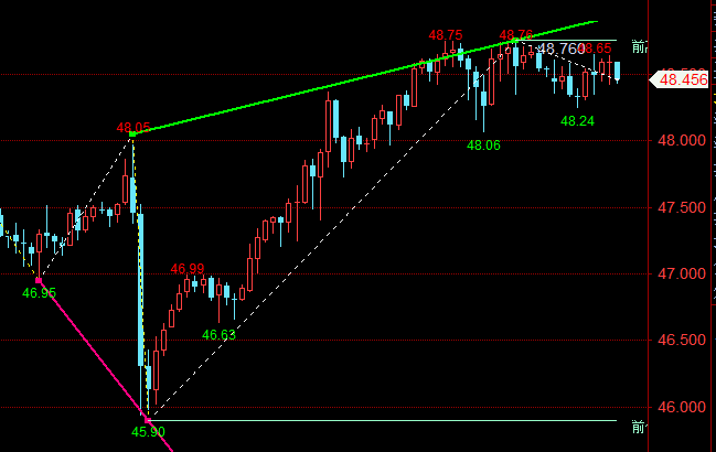 白银市场昨日开盘在48.045的位置后行情先回落,日线最低给到了47.928的位置后行情强势拉升,日线最高触及到了48.76的位置后行情整理,日线最终收线在了48.519的位置后行情以一根上影线稍长于下影线的中阳线收线,而这样的形态收尾后,今日48.1多止损47.9,目标看48.5和48.8和49-49.5。