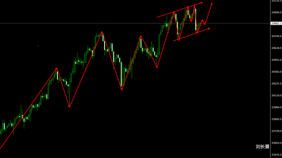 纳指市场昨日开盘在24977.71美元,后行情先回落给出24911.97美元,后行情快速拉升,日线最高触及到了25067.57美元,后行情美盘时段强势回落,日线最低给到了24775美元,后整理,日线最终收线在了24853.9美元,后日线以一根上影线稍长于下影线的中阴线收线,而这样的形态收尾后,纳指高位震荡中。综合来看,刘长景总结:纳指先涨后跌,依旧运行在震荡区间运行中,今日根据支撑继续看涨,操作上考虑回撤布局多单为先,高空为辅,上方关注2540-25100美元阻力,下方关注24800-24700美元支撑。