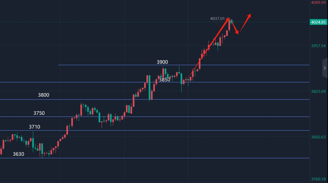 压力位:4037(当前新高,为短期首要压力)、4050-4055 区间(基于当前上涨斜率测算的下一阻力位)、4070-4075 区间(前期市场预期位,需警惕触及后的获利了结压力)。