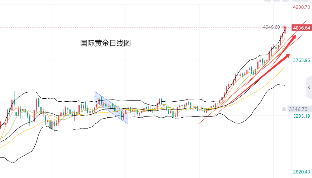 从之后的走势看,昨日周二欧盘盘中,黄金从日内低点3940美元触底反弹,美盘开盘后继续上涨,刷新历史新高至3990美元遇阻,回落3961美元企稳后,黄金收盘前涨至3986美元,继续保持上探趋势。周三黄金开盘上涨,延续隔夜的上升趋势,突破4000美元整数关口,最高涨至4049美元,短期表现十分强势,目前暂时交投于4037美元。总体来看,黄金受降息预期与避险买盘推动,继续保持上升趋势,市场看涨情绪强烈,推动金价不断创造新高。