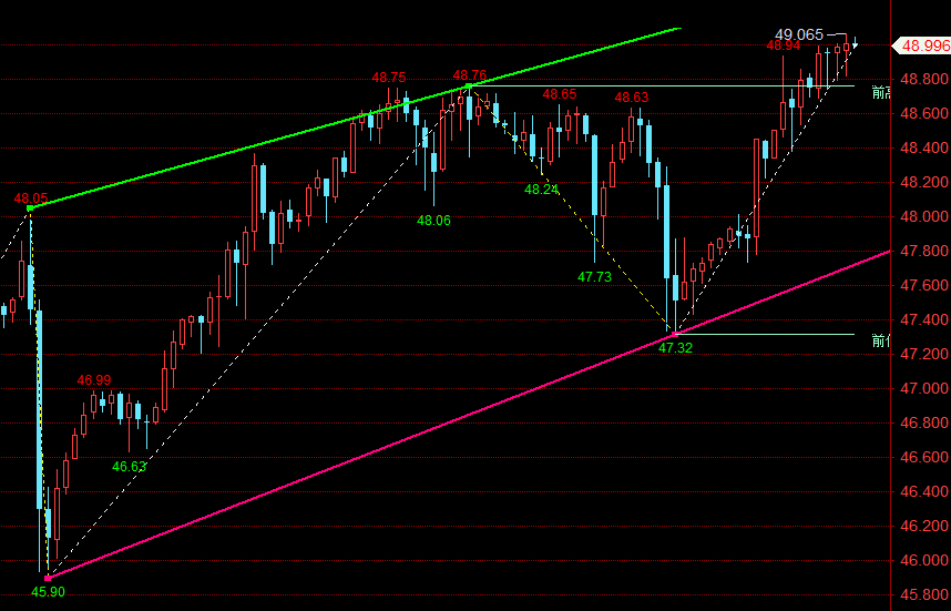 白银市场今日开盘在47.8的位置后行情小幅拉升给出48.0的位置后行情强势震荡回落,目前最低给到了47.73的位置后行情整理拉升,最高触及48.93位置,冲击历史高位49.78位置;综合来看,白银短线操作思路上以回调做多为主,反弹高空为辅,上方短期重点关注49.20-49.50一线阻力,下方短期重点关注48.50-48.20一线支撑。