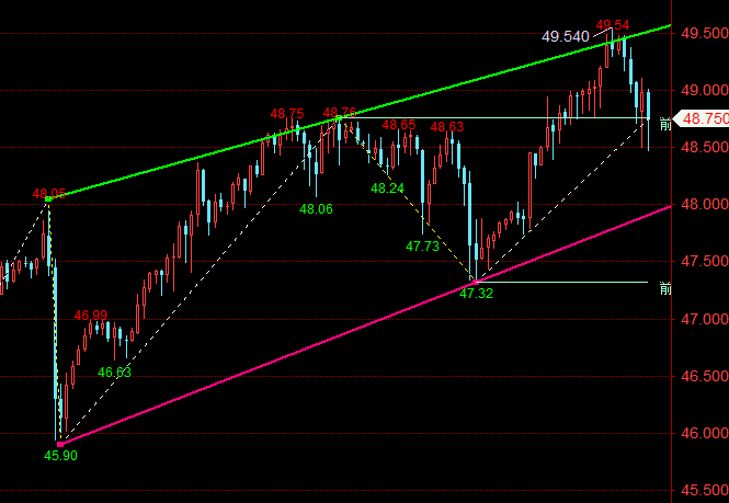 虽然现货白银早盘急速回落,最低在48.3,但是没有到支撑点,黄金在刷新高点后,白银价格是否能补涨刷新高点。在趋势作用之下,观察一下白银的回撤力度。综合来看,白银操作上建议上方短期重点关注48.7-49.0一线阻力,下方短期重点关注48.0-47.7一线支撑。