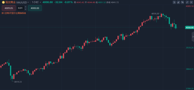 昨日黄金市场延续强势拉升趋势:早盘开盘在3984美元/盎司,开盘后行情蓄力最低触及3983美元/盎司,随后开启强势拉升,美盘时段,受基本面影响延续多头趋势,最高触及4059美元/盎司,最终收报4041.7美元/盎司。日线收取上影线较长的大阳线形态。本周以来涨幅已超4%。