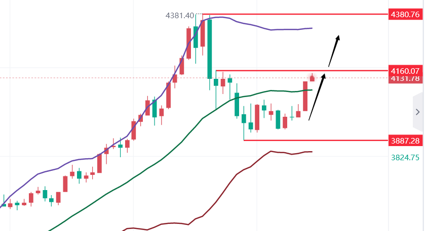 从技术面来看,日线底部震荡结束后,上涨行情已经突破布林中轨压制,接下来上方目标直指布林上轨4300。不过,前期下跌的高点4160仍存在压力,因此当前上涨需先突破4160。一旦站稳该位置,后市将有望挑战4300关口。在此之前,必须坚持看涨趋势。