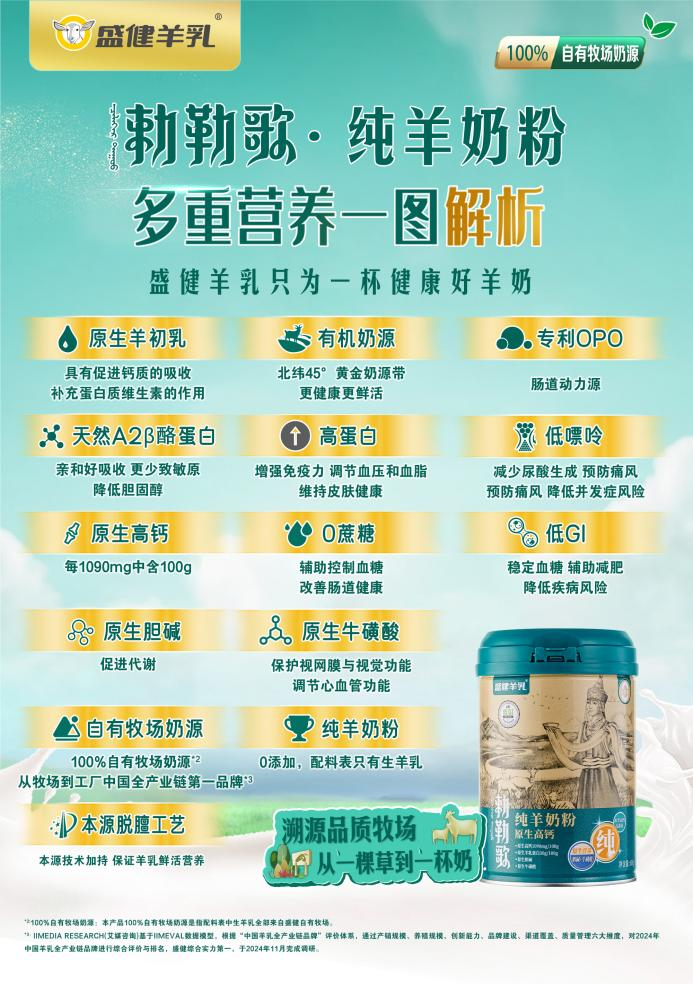 立冬过后,气温骤降,“温和滋补”成为家庭健康管理的关键词。营养学界共识:冬季进补需遵循“平补润燥、易吸收”原则,避免加重身体代谢负担。在众多滋补选择中,羊乳制品凭借天然温和的特性脱颖而出,而盛健羊乳旗下“勅勒歌・纯羊奶粉”,以全产业链的硬实力,成为守护全家冬季健康的温润之选。