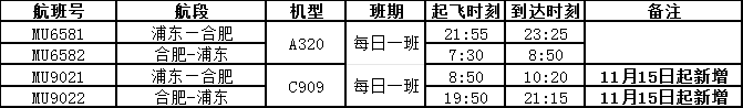 为进一步满足旅客国际中转及商务出行需求,东航将于2025年11月15日起加密上海浦东—合肥航班,由之前每日一班增加至每日两班,新增航班的航班号为MU9021/MU9022,由国产民机C909执飞,去程08:50由上海浦东起飞,10:20到达合肥,回程19:50从合肥起飞,21:15到达上海浦东。
