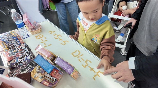 别开生面的意面游戏融合了数学思维与逻辑推理,迅速吸引了大量孩子踊跃参与。小朋友们全神贯注,在动手动脑中解开趣味题目,每当挑战成功,脸上无不洋溢着满满的成就感。这一充满巧思的环节也成功激发了家长的参与热情,他们或从旁鼓励,或共同思考,亲子间协作解题的温馨场景,成为赛场中一道亮眼的风景。