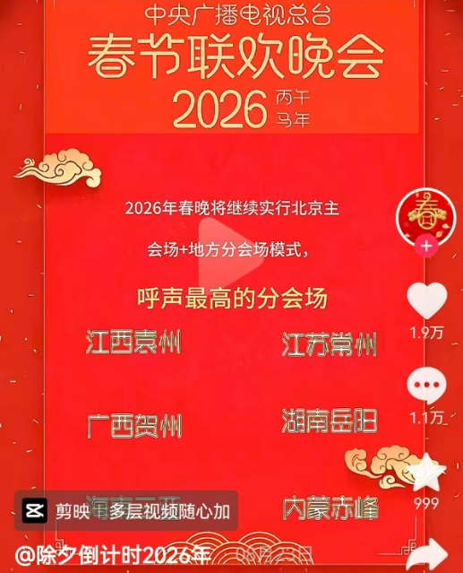 据悉,2026央视马年春晚总导演张一一将亲临“赣超”总决赛现场观摩比赛,“赣超”优秀球员、球迷代表将有望获邀登上2026央视春晚舞台或观众席。另外,日前已秘密建组的2026总台春晚导演组正在全国各省市甄选马年春晚分会场,从目前的网络民意支持率来看,江西宜春、江苏常州、广西贺州、内蒙古赤峰的网络民意支持率领先,你期待哪个城市入选春晚分会场呢?