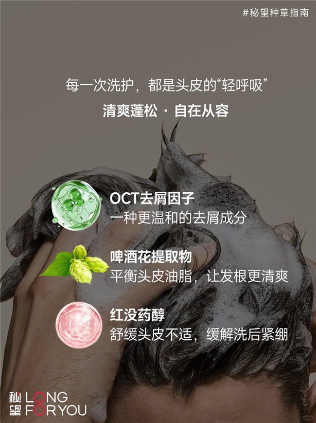 秘望推出的男士控油蓬松去屑洗发水,以OCT去屑因子(吡罗克酮乙醇胺盐)为核心成分,叠加啤酒花提取物与红没药醇,为男性头皮问题提供温和的解决方案。该产品通过成分协同作用,实现有效去屑、平衡油脂、自然蓬松的护理目标,让发丝保持干净、蓬松、清爽有序的状态。