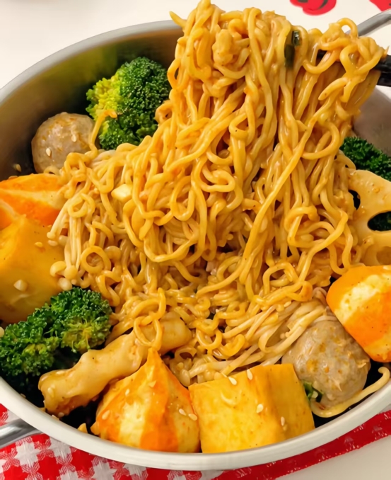 制作时,从冰箱取出必囤的海霸王牛肉丸、火锅饺及各种锁鲜丸子——这简直是选择困难症的福音。水沸后依次煮熟丸子、蔬菜和面饼,捞出后与秘制酱汁充分拌匀即可。
