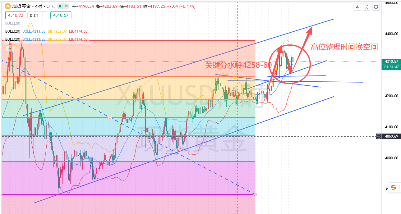 黄金技术上,低多主基调依旧稳妥获利拿下,短期多头关键分水岭依旧关注4258前低位置,一旦下破要注意深调风险,毕竟非农数据也只能算是喜忧参半并没有直接双双利多,配合技术上就是震荡上行节奏,操作上依托4258上方反复多即可,空单的话尽量避免依旧顺势而为低多。当前价格还是位于4258-4355区间内内震荡整理(时间换空间)总体而言,数据再次提振了震荡上行概率,依托二次起涨点4290附近多4280补,下破70损(轻仓)进行,备用策略4260-58多下破4244损(标准仓)。目标短线而言看4300破位看4345-50,留仓中长线持有!晚间站稳4290上方的话,那么接下来时间上新高就不远了,望大家能耐心等待新高!