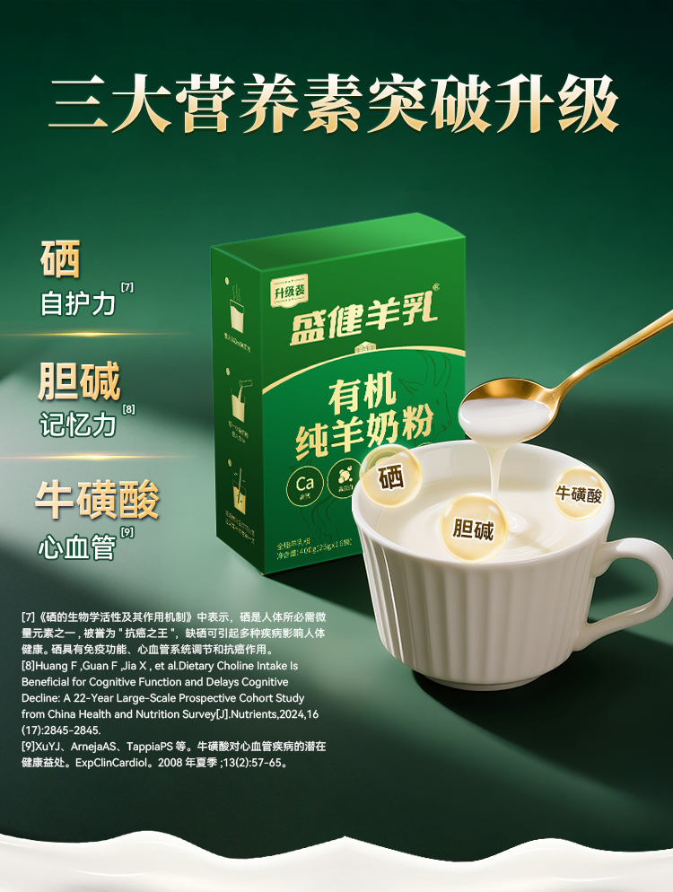 盛健羊乳有机纯羊奶粉升级装通过了中国有机产品认证,安全性高,且每100克中含30克优质羊乳蛋白与1100毫克原生高钙,搭配科学强化的胆碱、牛磺酸等营养素,形成全面营养矩阵。针对儿童成长需求,高钙与维生素D可协同促进骨骼发育;针对中老年群体的消化吸收需求,小分子蛋白减轻肠胃负担,原生高钙也可助力预防骨质疏松。