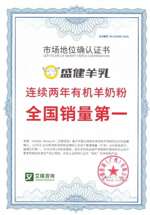 图:盛健羊乳连续两年有机羊奶粉全国销量第一
