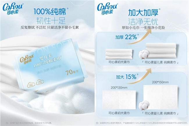 可心柔没有止步于 “材质升级” 的基础竞争,而是以用户需求为锚点,构建了 “硬品质 + 场景化” 的双重竞争力:一方面,通过 100% 纯棉原料、精细工艺及加大加厚的升级设计,夯实了 “安全、柔软、耐用” 的核心使用体验,解决了母婴及各类用户对清洁品质的核心诉求;另一方面,精准洞察冬季不同人群的场景差异,用四档细分规格覆盖通勤、护肤、独居、大家庭等多元需求。