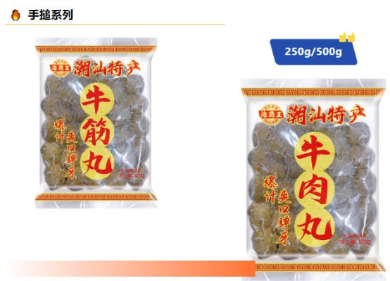 除了覆盖基础备货与批量供货需求,海霸王火锅丸子还打造了高端线手搥系列与虾滑系列。手搥系列作为潮汕特产,保留了传统手搥工艺的扎实弹牙口感,250g/500g的规格适配高端店定位,比普通丸子多了地域特色与品质感;虾滑系列则诚意十足,大颗粒黑虎虾滑含虾量高达95%,每一口都能嚼到完整虾粒,无论单独售卖,还是搭配高端锅底组成套餐,都能轻松拉高客单价,成为门店的“必吃招牌”。