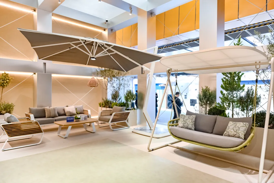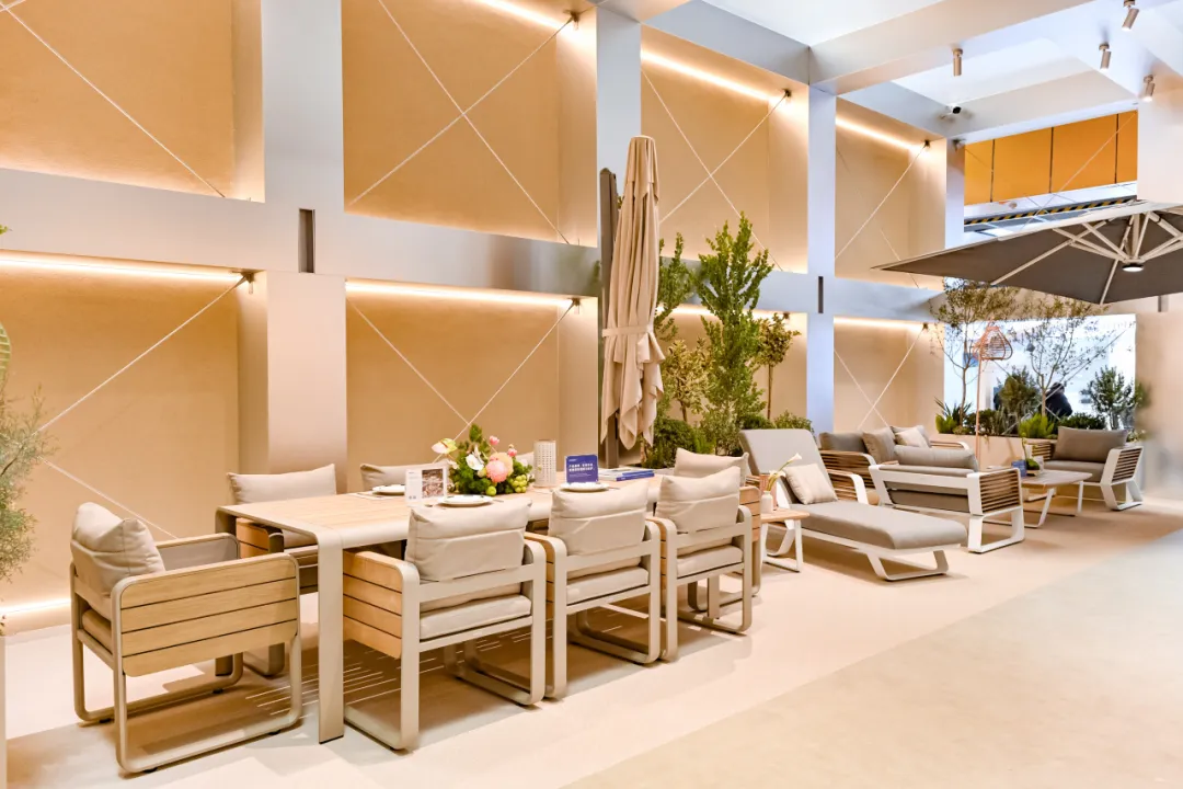 在厨房卫浴领域,集洗、切、沥功能于一体的悍高解冻水槽,凭借原创急速解冻科技吸引不少观众驻足;悍高西西里浴室柜融合天然石材与意大利AlPI木皮质感,嵌入智能魔镜与嵌入式冰箱,打造出奢雅的智慧卫浴场景;悍高BN5.0系列厨房龙头的三合一出水模式与旋转抽拉设计,展现了人性化的产品设计思路。悍高·原创智能五金馆的户外家具展品同样亮点纷呈:卡娜系列以鲸鱼般流畅的曲线塑造柔和形态,帕罗莎系列从海浪与沙滩中汲取灵感,诺丁汉系列则融合金属的工业感与柚木的温润,共同演绎出多元的户外生活美学。