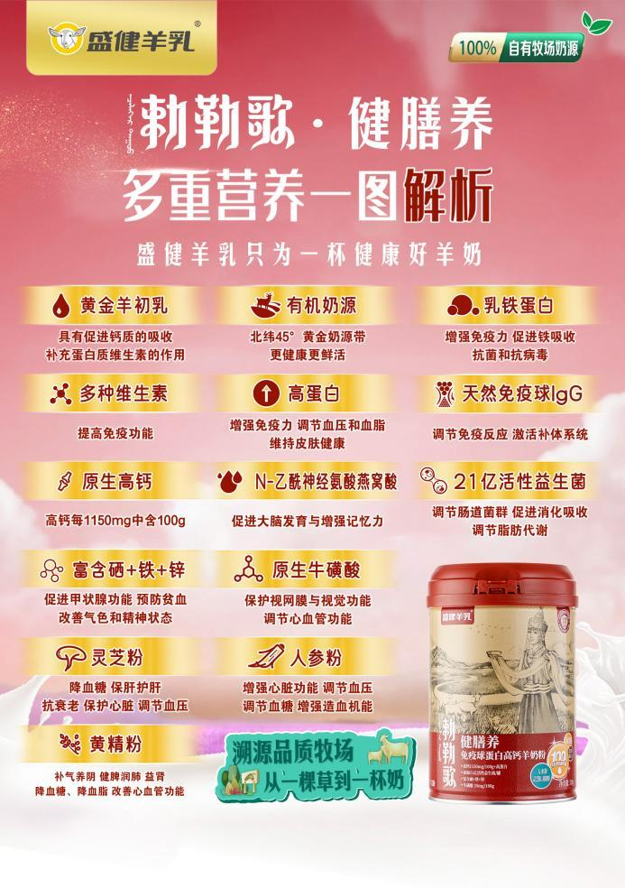 盛健羊乳“勅勒歌・健膳养”免疫球蛋白高钙羊奶粉的亮点远不止于此,它特别添加的羊初乳,为产品增添了独特的价值。这里的羊初乳,特指奶山羊产后72小时内分泌的珍贵乳汁,这一黄金时段的乳汁,是自然赋予的营养精华,也让产品在同类中形成差异化优势。无论是经常熬夜的年轻人,还是需要重点呵护的长辈,都能从这份精心调配的营养中获得滋养,契合了当下人们对精细化营养补给的追求。