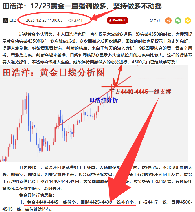 今天圣诞节假日休市,回顾近期本人一直强调做多的思路,并且一直在提醒大家回踩探底就是给机会做多的思路没有动摇过,本人也是积极分析出了多次探底进场的进场位置,这些都是大家有目共睹的,本周以来包括上周末文章分析也是强调本周一开盘必定走上行路线,结果已经知晓,本周开盘一路上行,突破4400关口,之后便一发不可收拾,接下来突破4500,也许是上涨太快或者是连日上涨太过疲乏,最高触及4526一线开启了回踩调整,我们也是在4520一线直接给了做空的策略,完美在4500一线获利出局,调整继续回踩,到了老许本人昨天给的4470一线支撑附近,也是直接做出了做多的策略,进场后金价也是如期反弹在4496附近震荡很长一段时间,我们就通知在4496一线获利出局了,全网可查,本人所说都是完全属实。