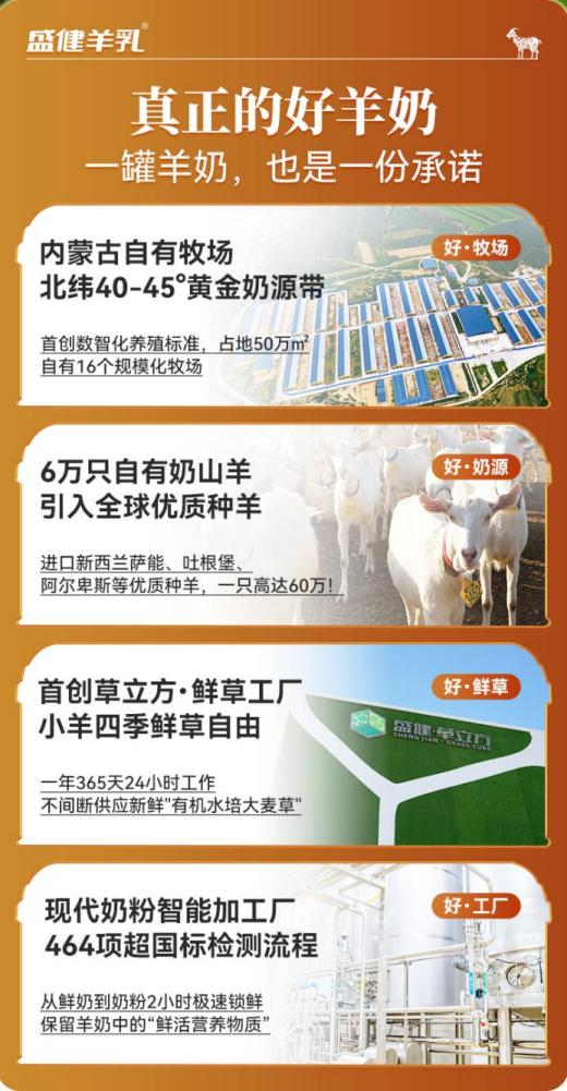 透明化追溯与消费者赋能,让信任看得见、摸得着。盛健羊乳羊奶粉实现“一盒一码”全程追溯,消费者扫码即可清晰查看奶源产地、加工流程、检测报告等全流程信息,让品质透明可感。针对消费者对优质羊乳的辨别需求,品牌整合专家建议与国标要求,推出“看配料表、辨价格地址、选全链品牌”实用指南,将专业知识转化为易懂技巧,切实为消费者避坑赋能。