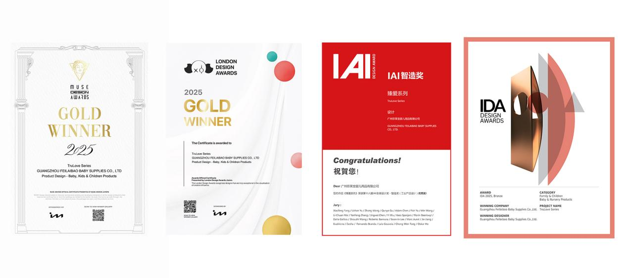 缪斯设计奖、伦敦设计奖、IAI全球设计奖、IDA国际设计大奖均是全球极具影响力的设计赛事,评审标准涵盖创新性、实用性、安全性等多个维度,菲尼贝贝FNBYBY能够连续斩获四项国际设计大奖,能在高标准的答卷上做出“好成绩”,不仅是展现了“臻爱如初”系列在设计创新上的实力,更展现了菲尼贝贝FNBYBY品牌领先国际市场的显著优势。