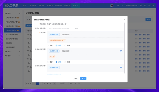 ✅ 标签自由运算”:支持抖音公域人群(官方推荐人群、竞品人群)与私域人群(品牌客户分组)的 “叠加、筛选、排除” 组合运算,实现标签数据互补;