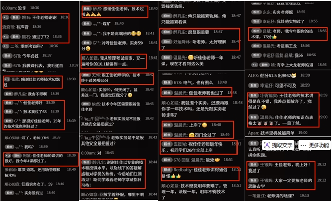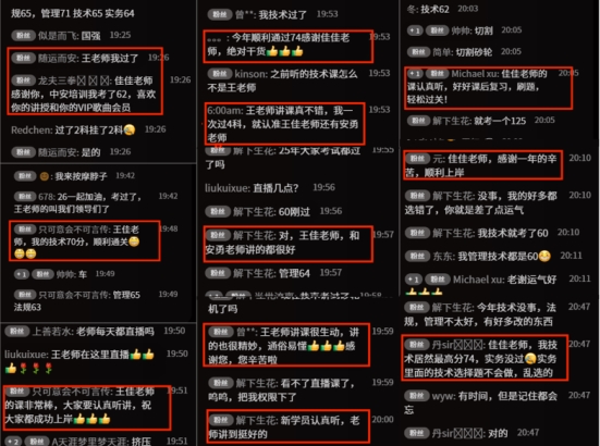 考后成绩公布后,学员们分享备考心得,有学员感慨备考不易与通关喜悦,更有学员主动推荐身边备考的朋友加入备考行列,而在考后第一讲技术精讲课上,学员们的热情更是直达顶峰。“(林洪正)佳佳老师讲课,有动态图,方便学习理解,很直观的”“(王友)感谢佳佳老师,技术一次性通过了”“(夏昕)多多听听佳佳老师的课”“(孙小辉)佳佳老师,68分,四科全过!”“(沐晴)佳佳老师好,未报喜,技术72,四科全过”……一条条带着喜悦的课堂聊天记录里,分享着学员们平时的努力,成为对老师们教学成果最直接的肯定。