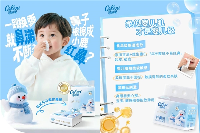 在核心性能指标上,推荐性国标(GB/T20808-2022)要求保湿型纸巾的多层柔软度≤240mN,而可心柔 BBI 标准将这一指标严格控制在≤100mN,更低的数值意味着纸张触感更细腻,对婴儿娇嫩皮肤的摩擦刺激显著降低;国标对保湿型纸巾的掉粉率要求≤0.5%,可心柔通过优化原生木浆原料与生产工艺,使护鼻纸不易掉粉,使用更洁净,从根源上避免了纸粉吸入或接触皮肤引发的不适。