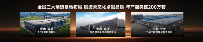 三大智造基地集群:布局于中山的4.0智能制造基地与中高端木作柔性化基地,以及河南兰考的规模化工程基地,共同形成了超200万套的年产能体系。通过自动化产线与数字化管理,实现了高定制需求下的精度、效率与稳定性平衡。