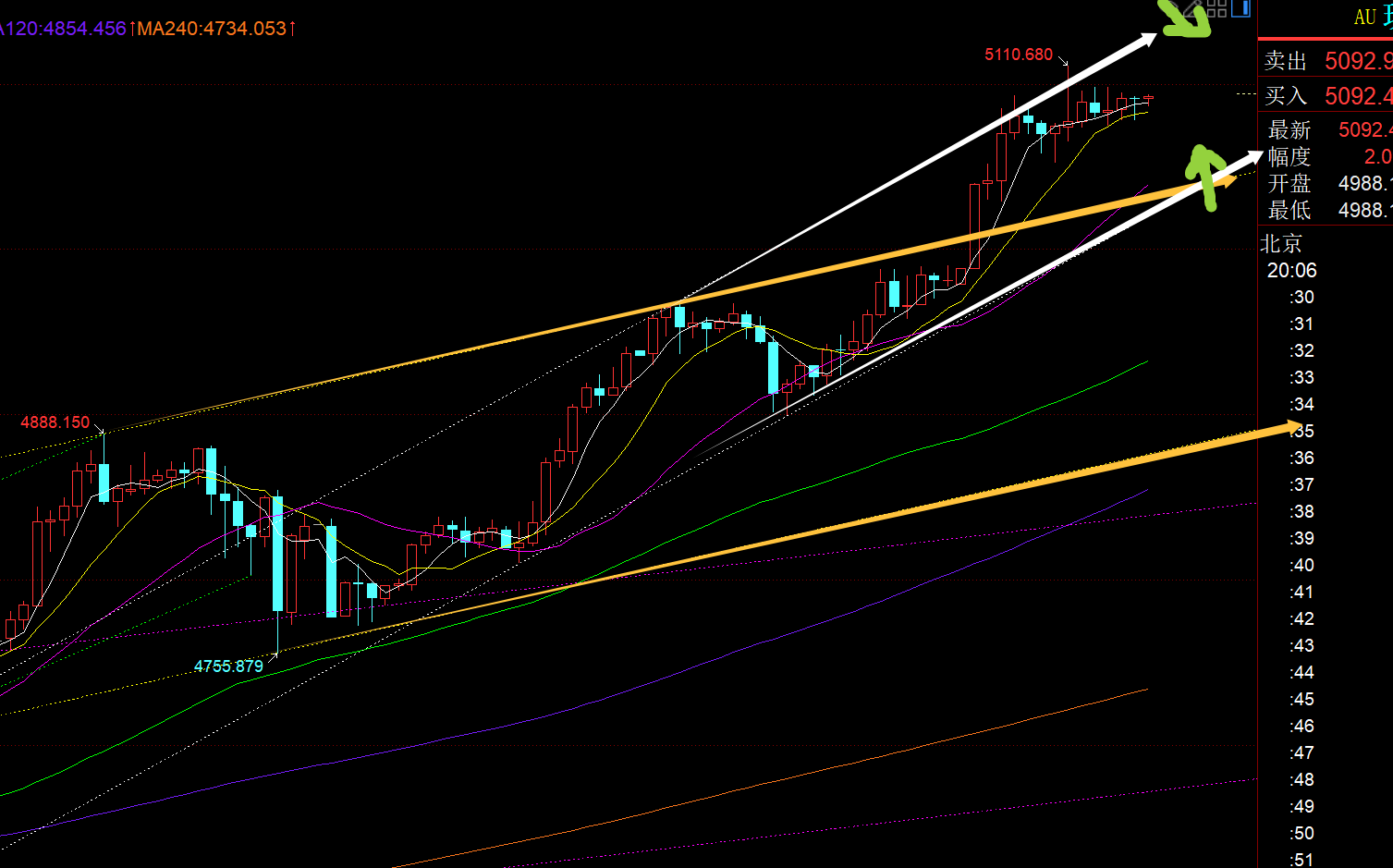 第二,黄金周线级别:参考最新通道上轨,本周留意5140-38一线上轨阻力得失;中期也是维持趋势看涨不变;