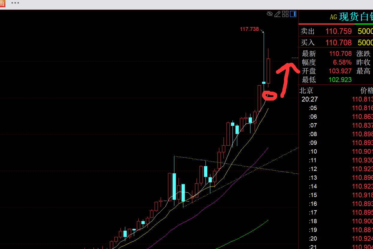 第二,白银方面:昨日早间从103直接一路飙升至最高117.7一线,历史上最大一次单日涨幅,结果后半夜又从117.7跳水跌至最低102,日内单日最大跌幅;一来一回进行疯狂收割;