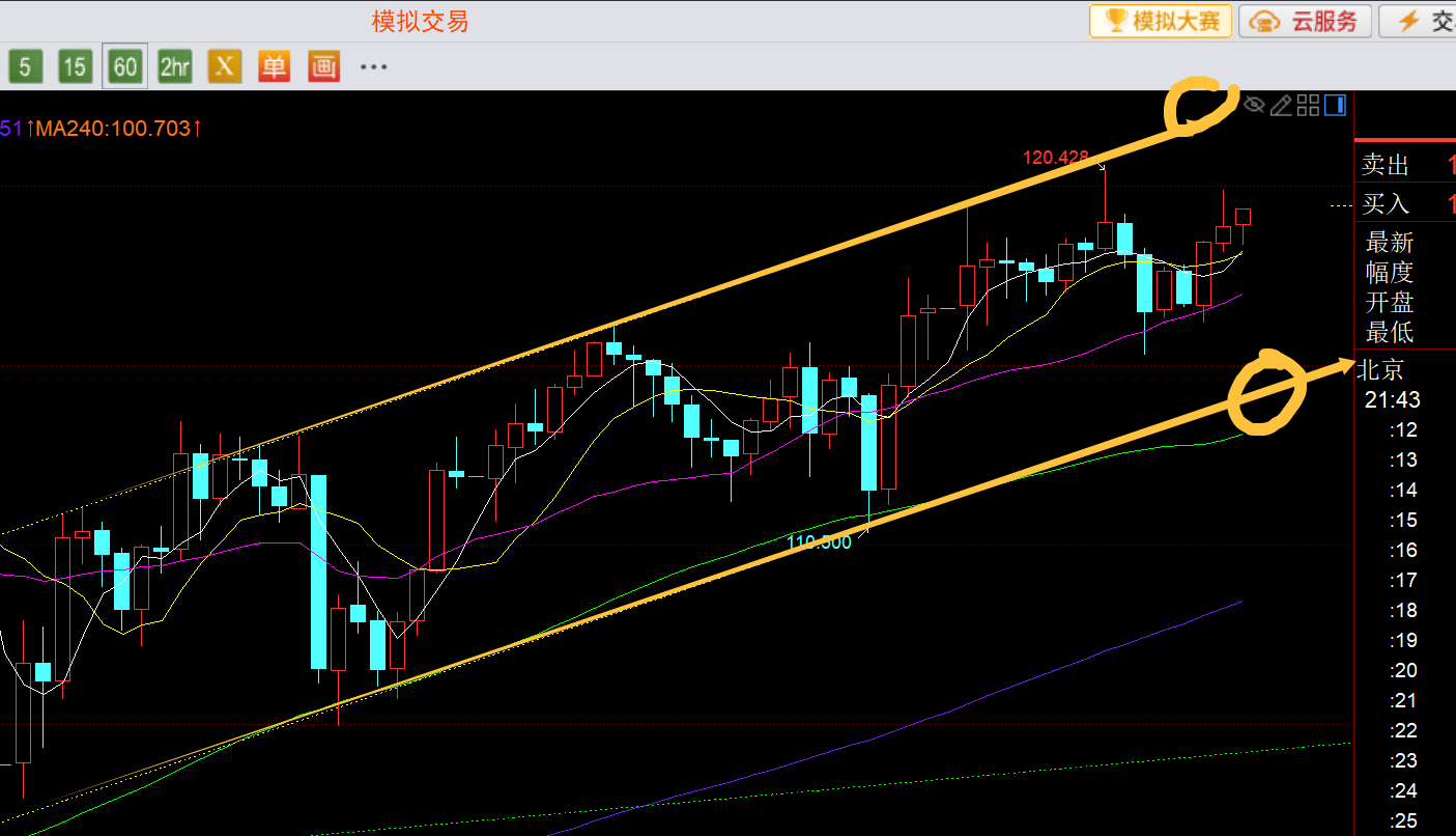 白银方面:目前还处于黄色上行通道内,上轨上移122-123左右,下轨支撑上移114.5-115,留意此区间内运行得失; 日线5日支撑上移110, 10日支撑上移102-101,只要拉低企稳都是继续北上为主;