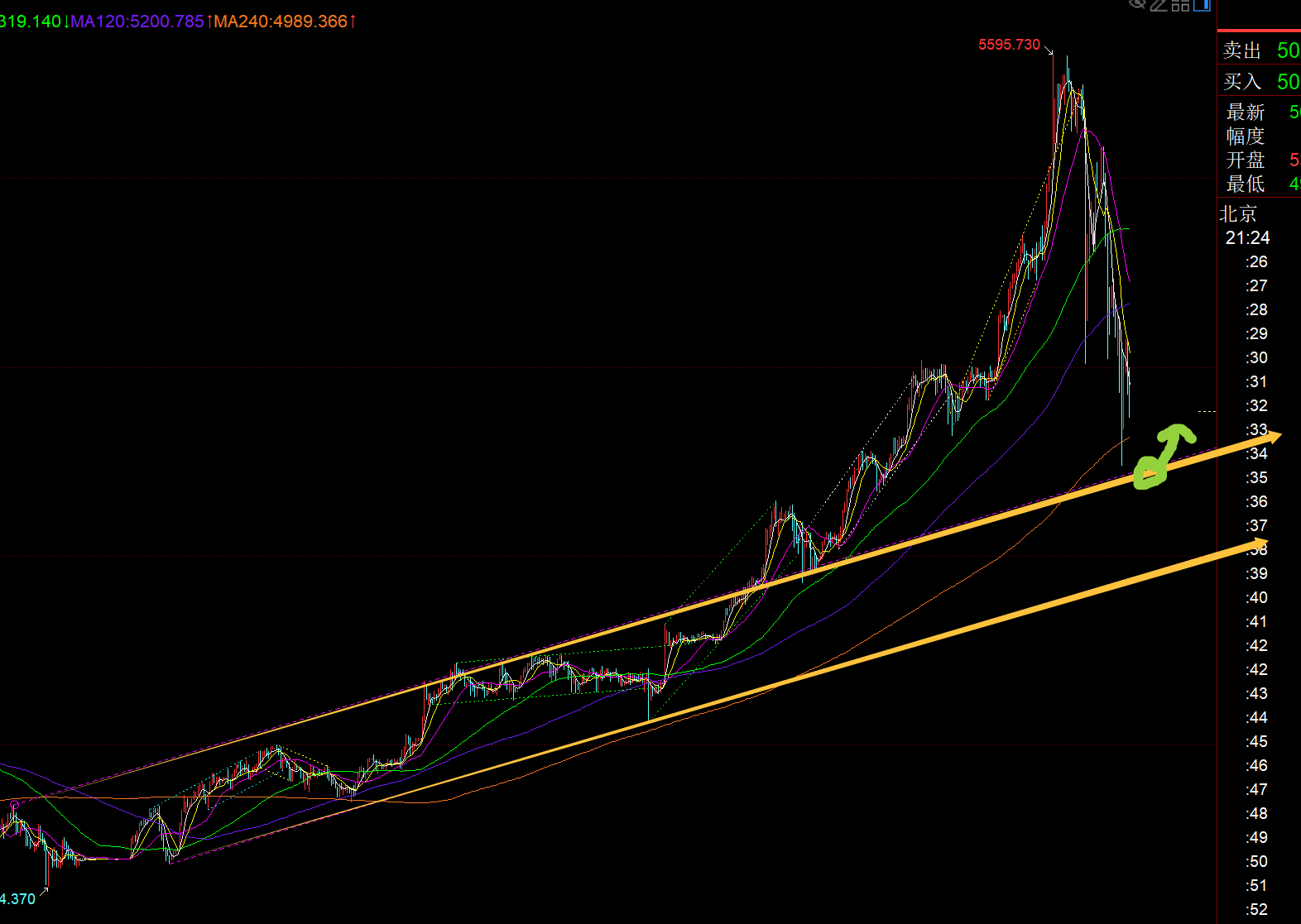 第一,黄金日线级别:昨日收报下影线长于上影线的纺锤体阴K,低点暂时企稳于4274-5598的382分割支撑5093上,今日目前出现大阴K,失守5均线,直接刺破了10均线5020,低点打到了50分割支撑4936上;那么作为一波强势单边拉升,修正的最大程度一般是短期均线,而10均线比较关键,因为守住它,则还能继续维持强势逼空状态,很快过几日又会爬升高位;若守不住10均线,那么就可能试探中轨,也是作为强势行情,最后的底牌;并不是说,失守了中轨,短趋势就改变了;而是失守了中轨,想要再回归强势单边格局,就要花更多的时间来整理酝酿,类似3500、4381那两次的整理;所以,今晚我们暂时盯住10均线的得失情况,以及50分割支撑4936的得失,能收盘稳住,且处于10日附近不远,那么下周初还是有很大希望尽快恢复强势拉升格局;