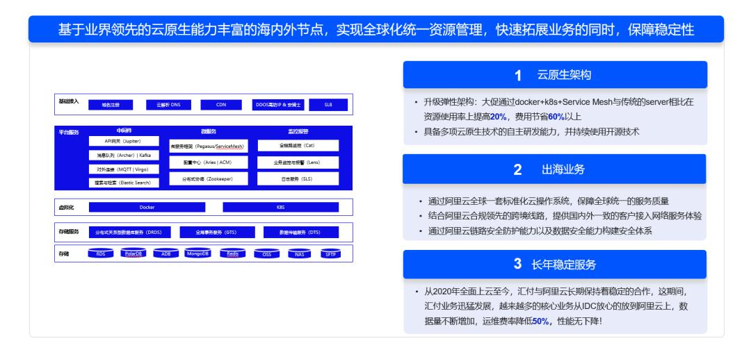 汇付支付与阿里云携手构建“全球一朵云”,依托业界领先的云原生能力和丰富的海内外节点,结合汇付支付五年多的国内外云业务实战经验及工程化能力,为客户提供全球出海业务系统托管服务。