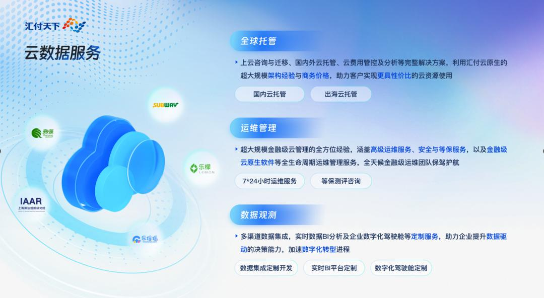 汇付云数据作为汇付支付的云技术服务商,为中国企业出海提供了一站式解决方案,涵盖全球出海业务系统托管、业务数据合规咨询与落地以及跨境支付业务对接。