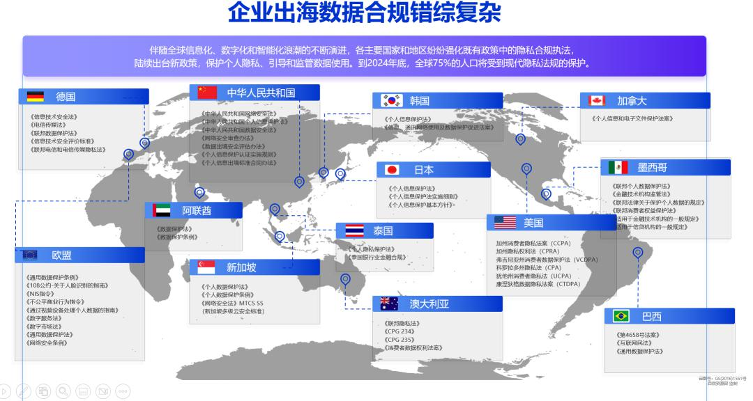 海外业务数据的合规运营是企业出海后的一大难题,不同国家和地区的合规要求复杂多样。