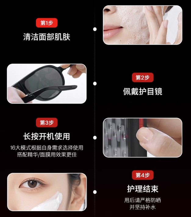 使用细节决定护肤安全与效果:照灯前需清洁皮肤,干性和敏感肌可涂轻薄护肤品保湿,避免厚重油脂影响光效;保持30-40cm照射距离,佩戴附赠护目镜保护眼睛。注意月经期、孕期避免使用,照灯后肌肤屏障活跃,务必加强防晒和保湿。