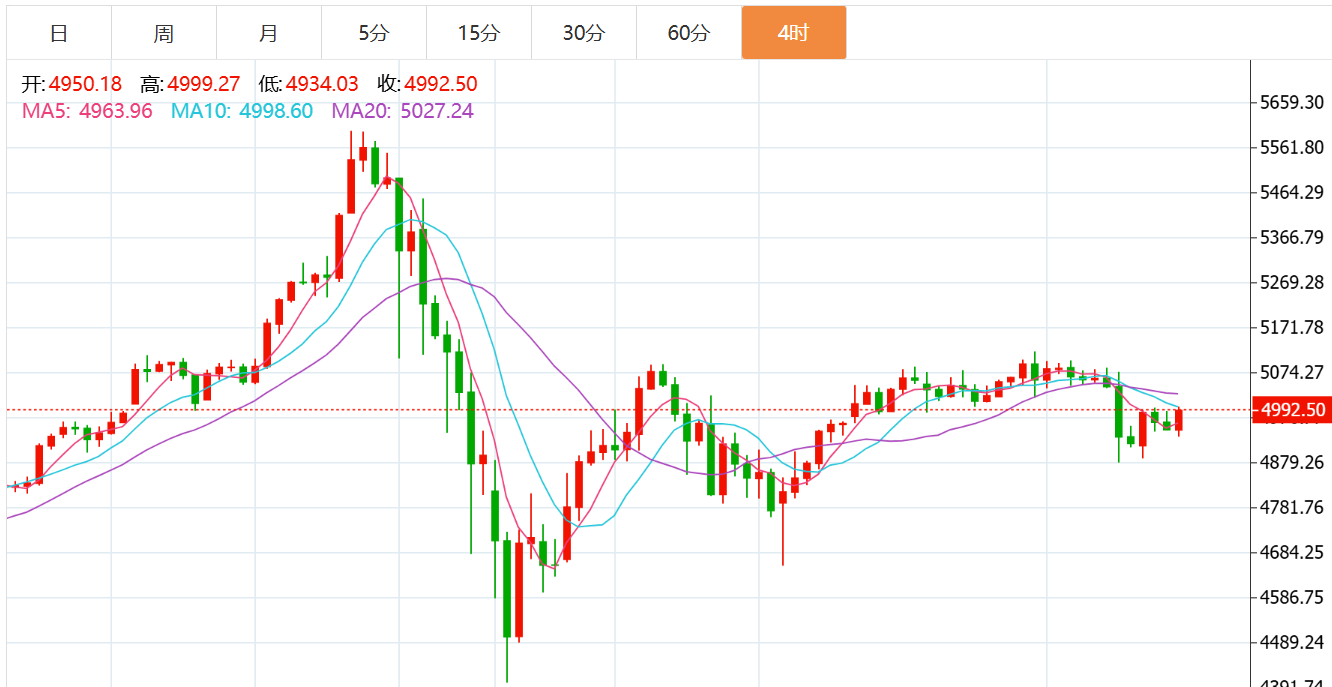 4 小时图上,现货黄金正在测试 50 期均线(4958.24)支撑,下方关键支撑先看 4850 美元附近,其次是 200 期均线(4956.476),若跌破该位置,下行空间将进一步打开。