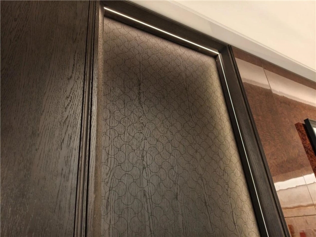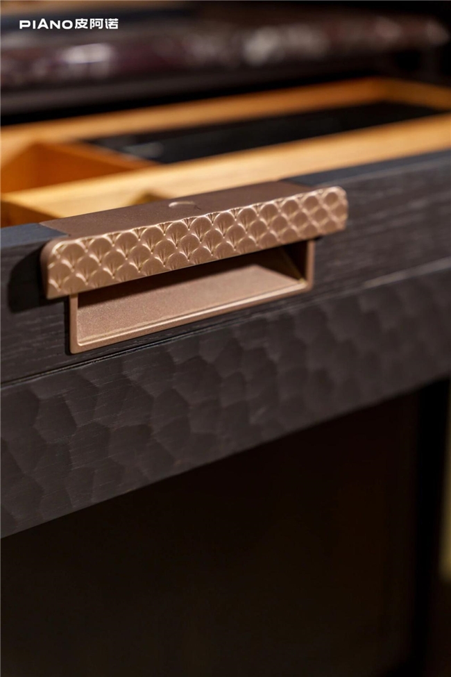从银杏叶饰面板、立体肌理纹理拉手到激光雕刻的木皮墙板等,实现了美学与品质的双重表达。