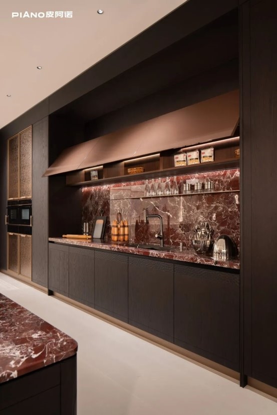 “风华”系列厨房以开放式社交西厨进行呈现,通过开放式布局,将双中岛为核心,形成社交动线,用烹饪时的互动、调酒时的交流...构建社交型无界空间。