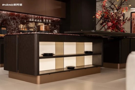 因此,在“风华”社交西厨里,除了大师设计的元素外,在收纳方面有更强大的系统支持,比如双岛台设计的收纳区,以飞碟拉篮解锁转角调酒收纳,通过岛台为空间枢纽,链接社交。