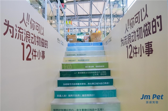 除了公益义卖,诚实一口在展位设置了公益墙,纯白的墙面上书写了醒目的大字“人!你可以为流浪动物做的12件小事”,一阶阶的楼梯上写满了人类可以为流浪动物做的小事,“笨蛋人类!领养不弃养”“阳台封好才安全喵”“人!要提醒医生在给我绝育后打上耳标,公左耳,母右耳!”……通过小动物自述,温馨提示了人类可以为流浪动物做的12件事。从投喂到绝育,再到领养,诚实一口始终在用自己的方式为流浪动物谋福祉。