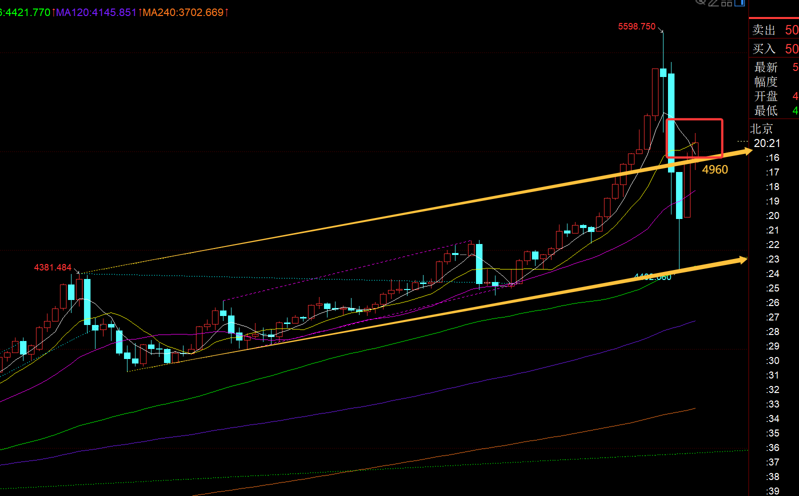 第一,黄金方面:昨日早间开盘直接拉高,随后回踩4715上顶底支撑提示去跟随看涨,但价格只给到4745,午后一路走高至4950一线;这几天都是剧烈波幅,每天几百米的波动,位置抓住了,再加上刚好运气不错,遇到快速拉升,利润就相对丰厚;而预期位置不给,提前去直接试探,又考虑到止损的范围过大,也就不敢去试探,结果踏空;美盘是符合研报提及的震荡区间4960-5000阻力,4880上支撑,但还是没去试探,一方面触及支撑或阻力的次数过多反复,总担心会踩坑,另一个方面由于时间太晚,没留意价格,也错失了机会;